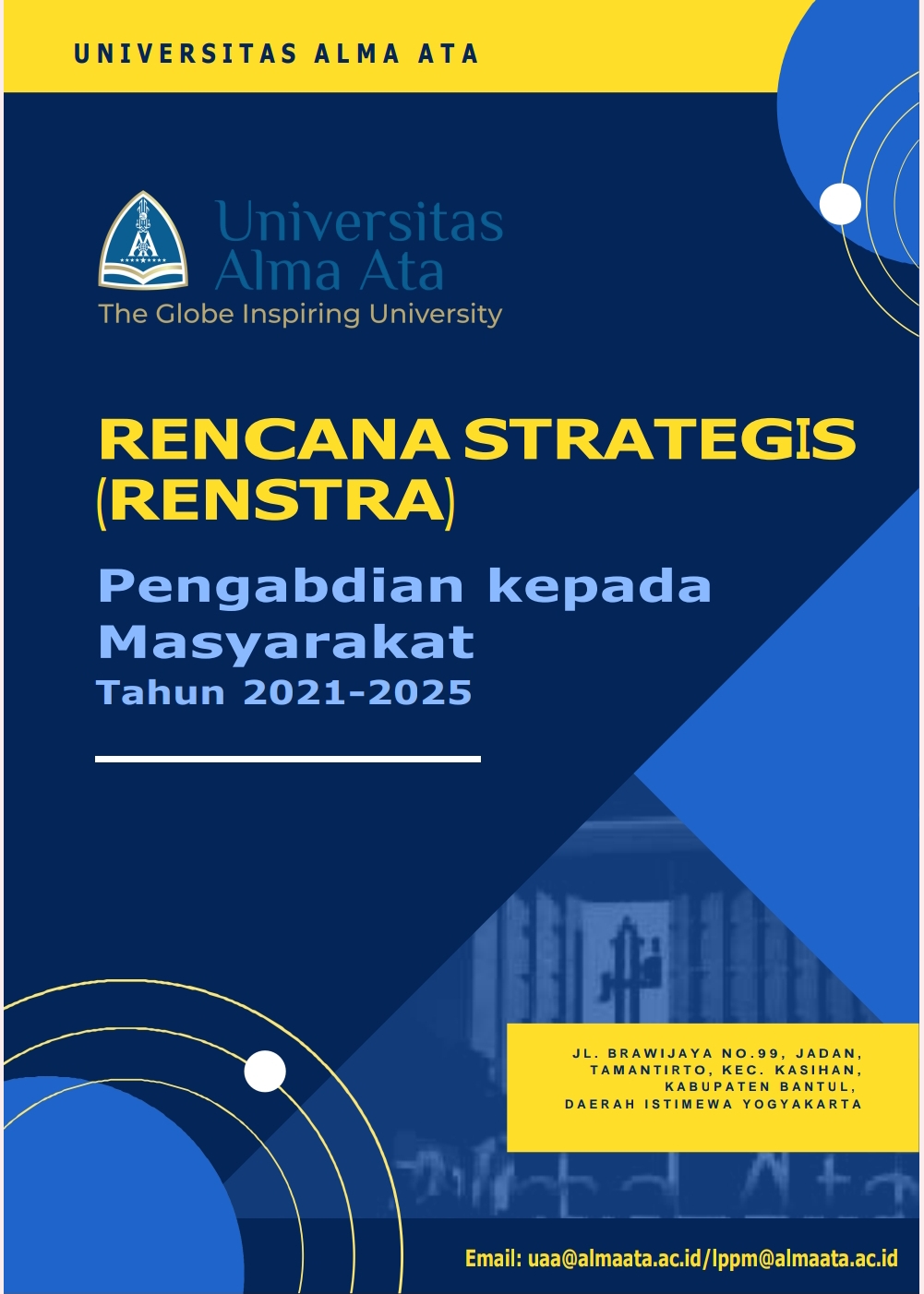 Rencana Strategis (Renstra) Pengabdian Masyarakat Universitas Alma Ata merupakan arah kebijakan dalam pengelolaan pengabdian masyarakat di tingkat universitas yang dibuat dalam periode waktu 5 tahun (2021-2025). Adapun fokus pengabdian masyarakat yang dirumuskan adalah mengacu dari hasil penelitian sesuai dengan Rencana Induk Penelitian (RIP),